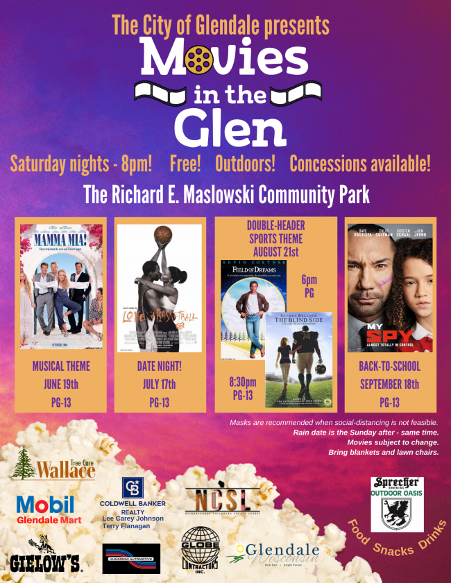 The City of Glendale will be hosting 'Movies in the Glen' at the Richard E. Maslowski Community Park this summer. These events are open to the public; we would love to see you there!